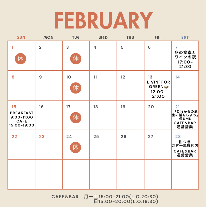 ◆2月15日(日) 9:00-11:00(10:30 L.O.)